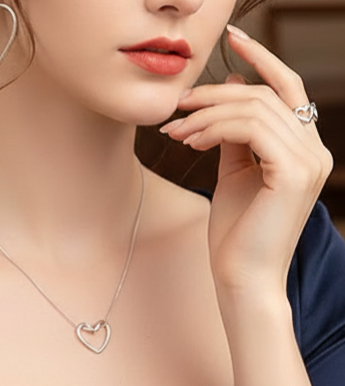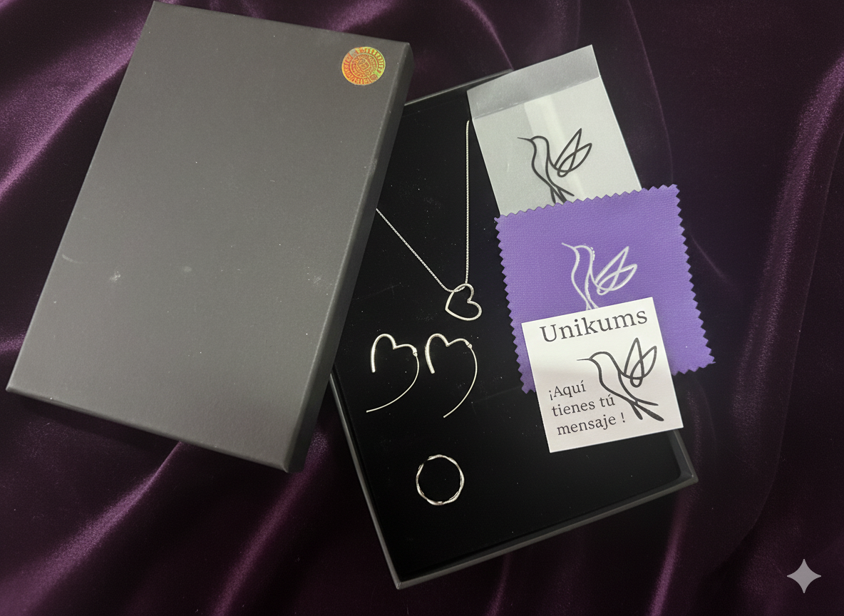 Incluye collar, pendientes y anillo, piezas ligeras y delicadas que representan el amor en su forma más pura: sincero, libre y continuo. Su acabado pulido realza la luz y aporta un brillo sutil, perfecto para acompañar tanto el día a día como momentos especiales.