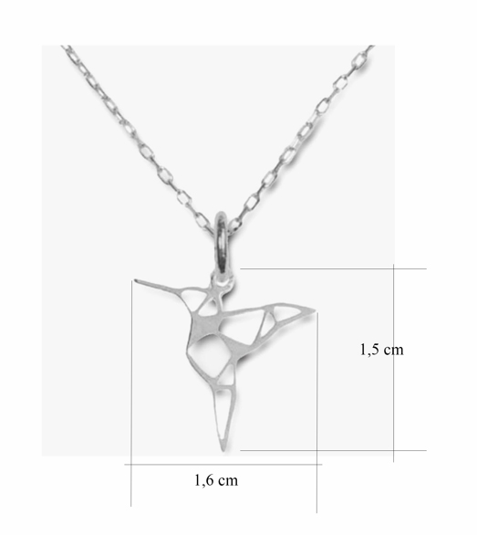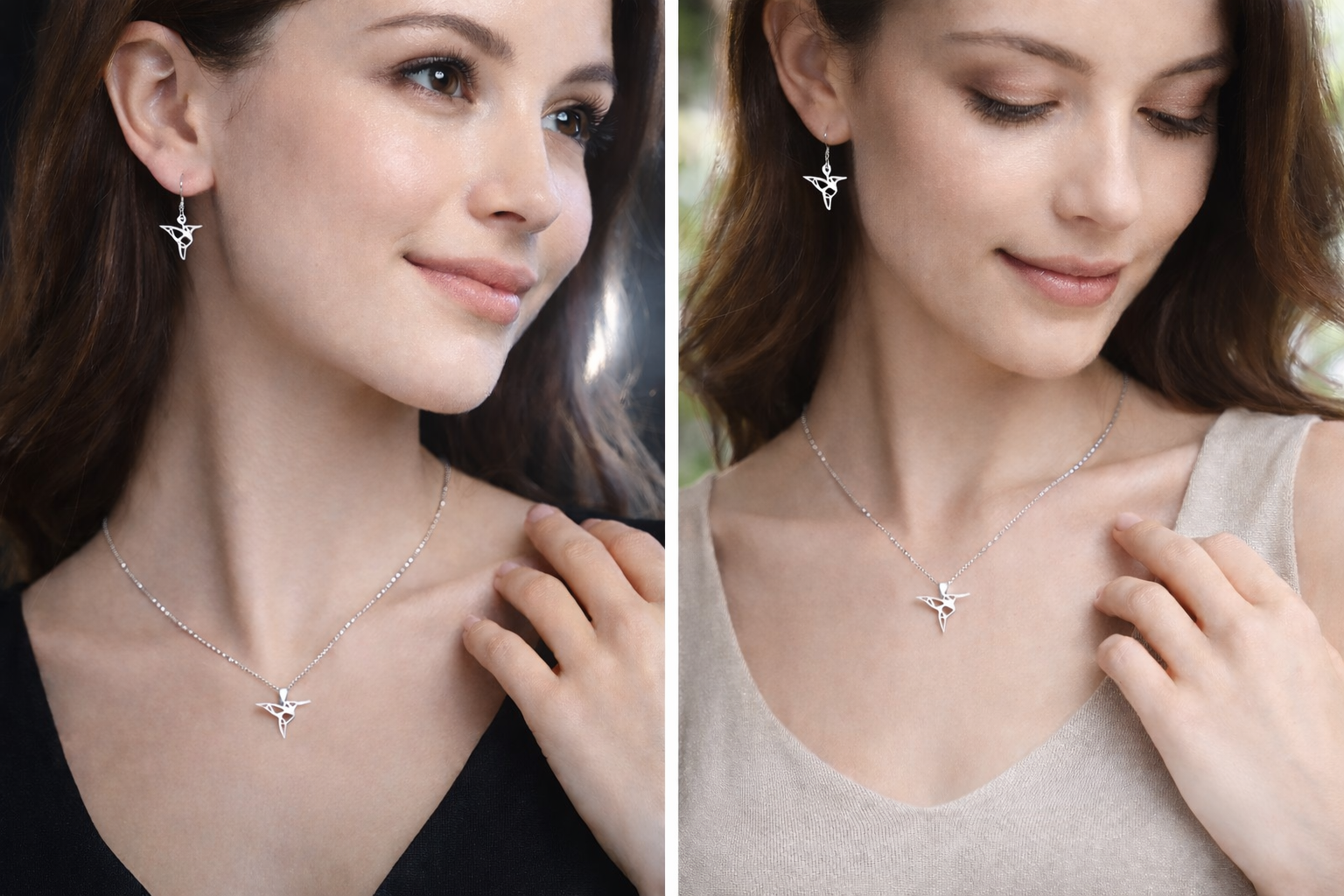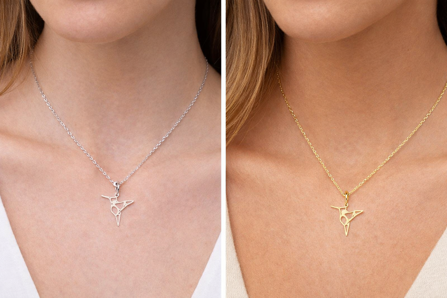 El colgante geométrico, inspirado en el arte del origami, aporta un toque sofisticado y minimalista que encaja perfectamente con cualquier look, desde el más casual hasta el más elegante. Los pendientes a juego, ligeros y delicados, realzan el rostro con una estética moderna y femenina.