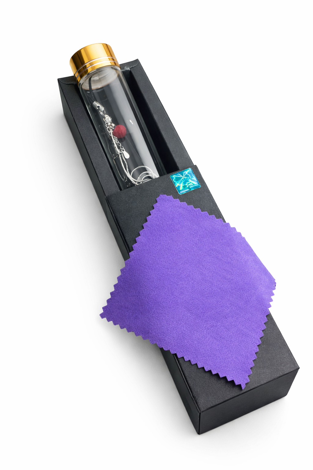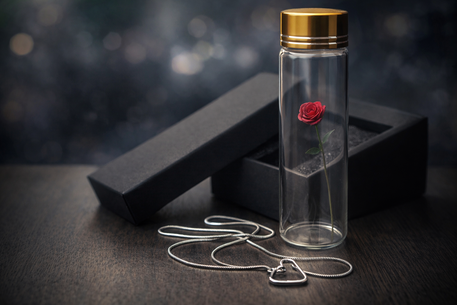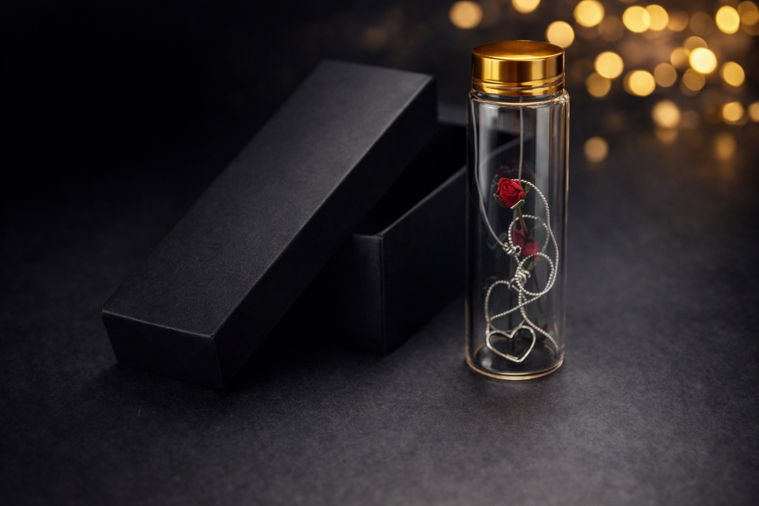 El collar está fabricado en plata de ley 925, con una cadena fina y un colgante en forma de corazón, símbolo de amor y conexión. La rosa de porcelana, cuidadosamente elaborada, se conserva intacta con el paso del tiempo y se presenta protegida en una botella de cristal transparente con tapa metálica dorada, creando una presentación refinada y decorativa.