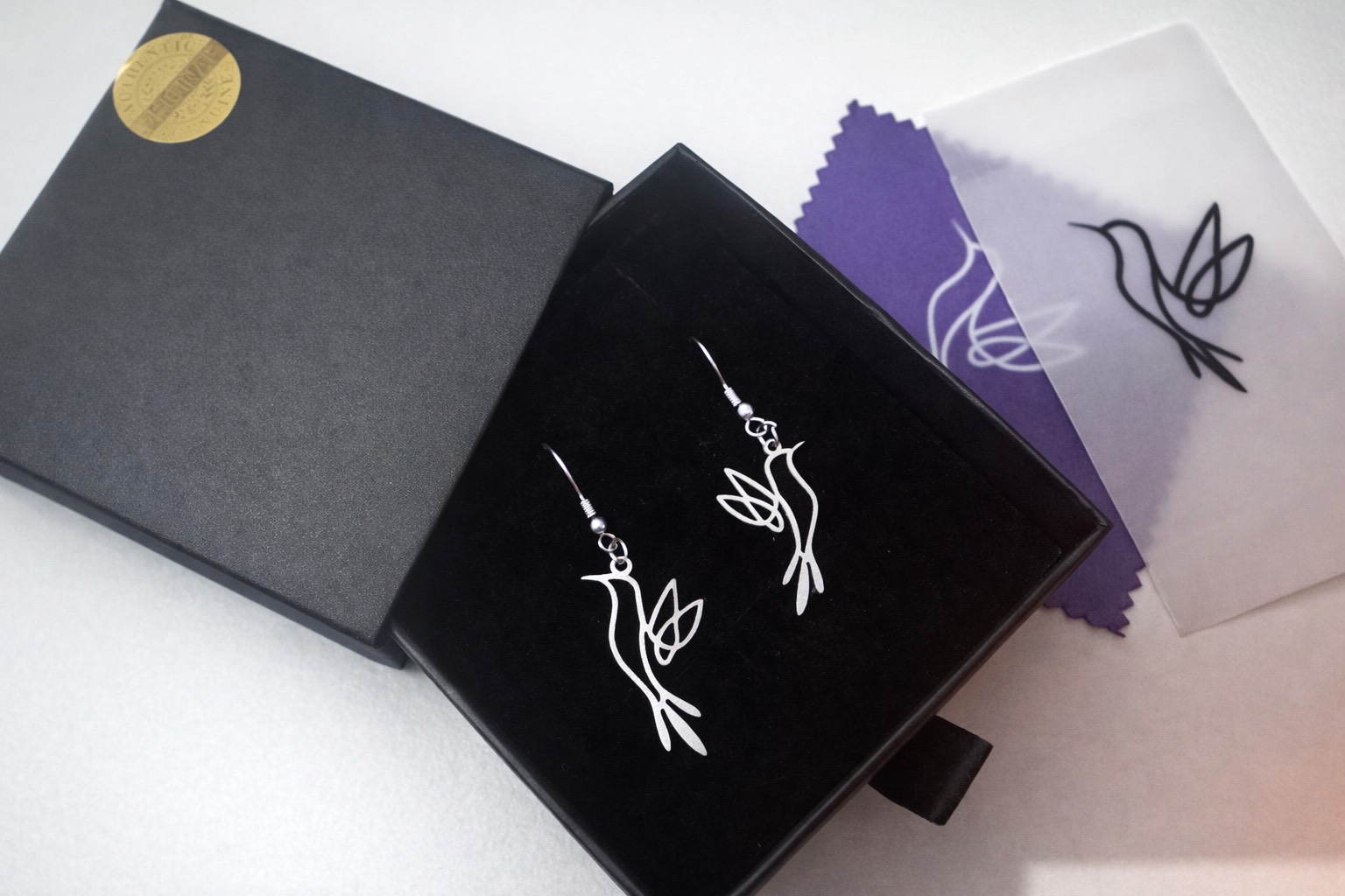 Pendientes de acero inoxidable 316 con diseño de colibrí inspirado en la Leyenda Maya. Incluye  packaging premium, tarjeta QR/NFC para mensaje personalizado y sello de autenticidad. Portes incluidos.